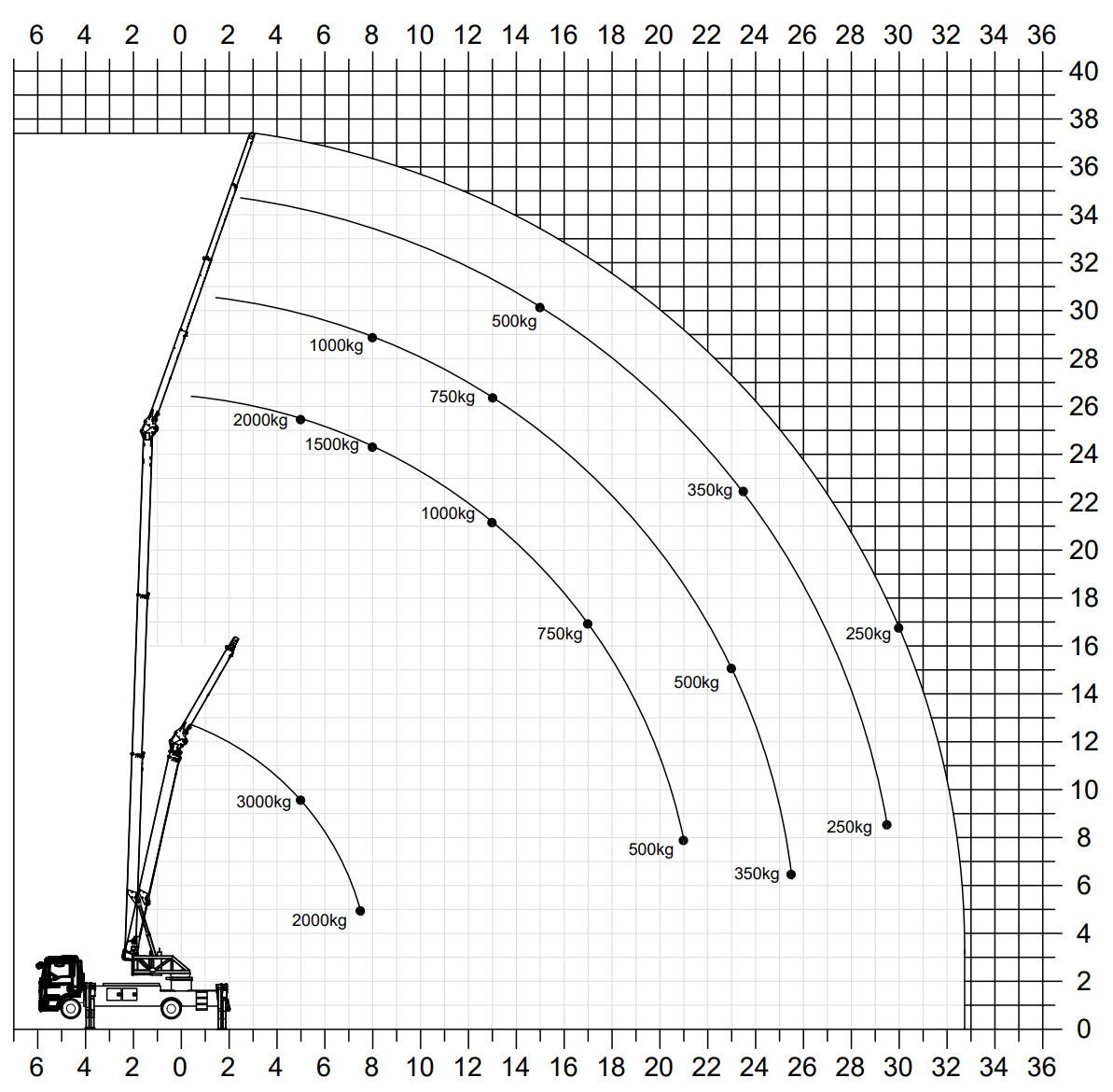 Cette grue sur camion a une hauteur maximale de crochet de 36,5 mètres.