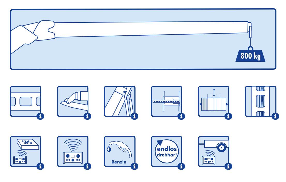 Deze aanhangerkraan is dé ideale hulp bij verbouwingen en dakwerken, zowel voor renovatie als nieuwbouw. AMAK 28 heeft een compacte opstelruimte middels handmatige afstempelbasis en is eenvoudig te manoeuvreren dankzij de hydraulische wielaandrijving en slechts één as. Het totaalgewicht van de AMAK 28 is slechts 2.800 kg. Deze kraan heeft een zuinige benzinemotor voor de kraanfunctie en is leverbaar in RAL-kleur naar wens.